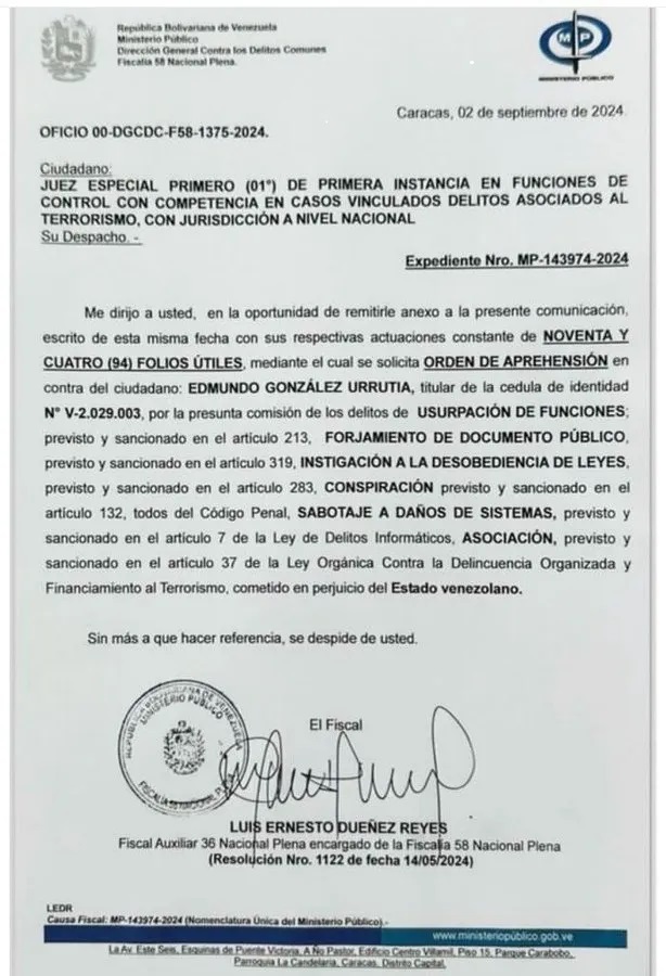 En sus redes sociales la Fiscalía del régimen exhibió la “orden de aprehensión en contra del ciudadano Edmundo González Urrutia” por presuntos delitos relacionados con los comicios, que incluyen “desobediencia de leyes”, “conspiración”, “usurpación de funciones” y “sabotaje”.