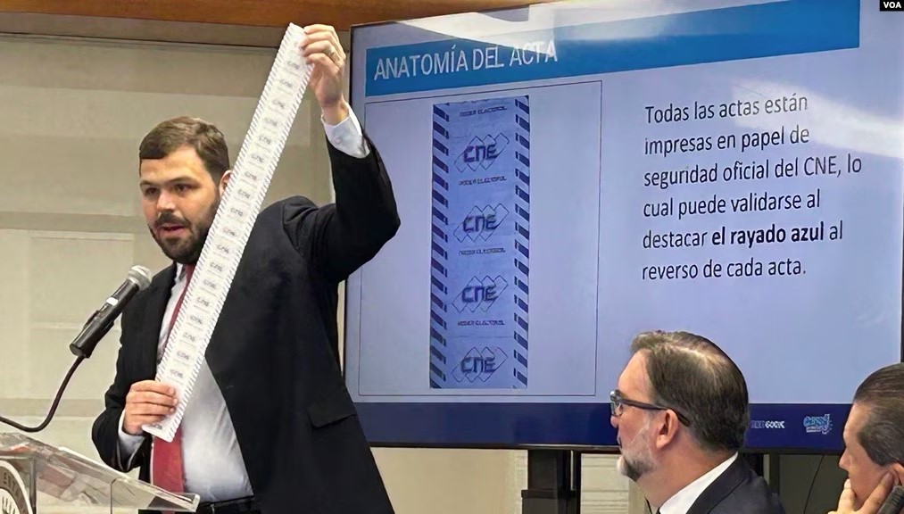 Durante la presentación del informe, Silva, quien se ha exiliado ante la represión poselectoral, explicó cómo funciona el sistema de transmisión y los inviolables códigos de seguridad de las actas, que hacen imposible su manipulación.