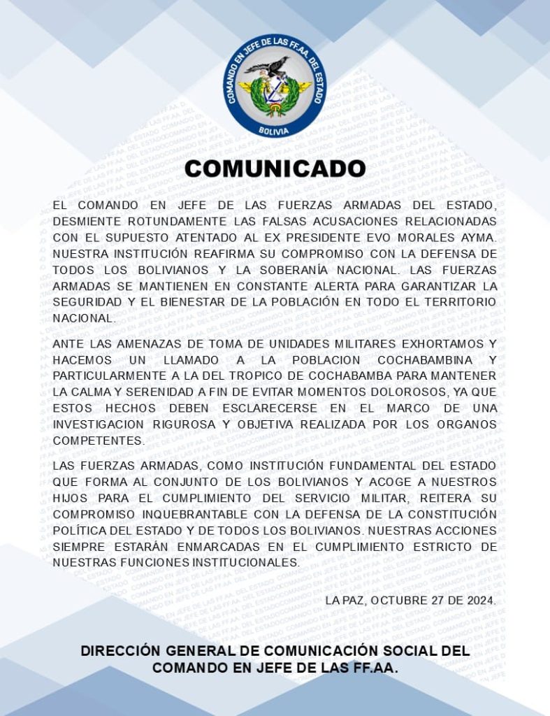 “El Comando en Jefe de las Fuerzas Armadas del Estado desmiente rotundamente las falsas acusaciones relacionadas con el supuesto atentado al expresidente Evo Morales”, señala parte del escrito.