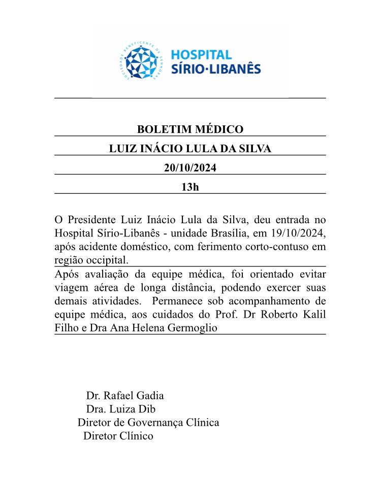 Bajo la atención de los médicos Roberto Kalil Filho y Ana Helena Germoglio, el presidente fue aconsejado para “evitar viajes aéreos de larga distancia, aunque pueda realizar sus otras actividades”. El presidente permanece bajo la supervisión del equipo médico.