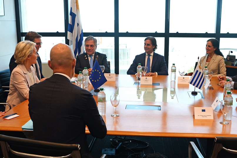 El presidente de Uruguay, Luis Lacalle Pou, recibió este jueves 5 en la Torre Ejecutiva a una delegación de la Unión Europea, encabezada por la presidenta de la Comisión Europea, Ursula von der Leyen. La visita se concretó el marco de la LXV Cumbre del Mercosur, que tratará como uno de sus temas principales la aprobación del texto del acuerdo de asociación entre ambos bloques regionales.