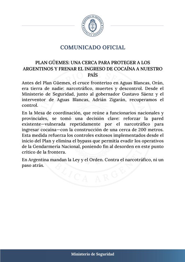 La ministra de Seguridad de Argentina, Patricia Bullrich señaló: “Desde el Gobierno Nacional impulsamos la cerca en Aguas Blancas para cuidar a los argentinos del narcotráfico. Por eso, con el Plan Güemes incorporamos una nueva medida de refuerzo al control en la frontera, que se encontraba completamente descontrolada”, escribió en su cuenta de X.
