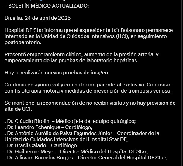 El exmandatario brasileño Jair Bolsonaro (2019-2023) atraviesa por un delicado cuadro médico, esto tras haberse sometido a una cirugía intestinal esta semana, informó el hospital DF Star de Brasilia, donde se encuentra internado.
