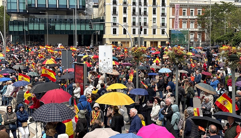 Con la consigna ‘Por la dignidad de España: Sánchez dimisión, elecciones ya’, la Plaza de Colón en Madrid fue el centro de la masiva protesta de miles de españoles este sábado, exigiendo un cambio de rumbo en el país, ante el desgobierno de Pedro Sánchez.