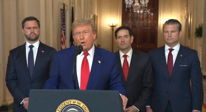 Tras el ataque de aviones de EEUU contra las tres principales instalaciones del programa nuclear iraní el presidente Donald Trump, brindó un discurso a la nación desde la Casa Blanca donde expresó que “las principales instalaciones de enriquecimiento nuclear de Irán han sido total y completamente destruidas”, en referencia a los sitios de Fordow, Natanz e Isfahan, atacados en la madrugada del sábado.