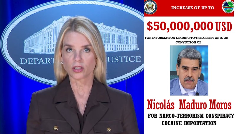 “El reinado de terror de Maduro continúa. Es uno de los narcotraficantes más peligrosos del mundo y una amenaza directa a la seguridad nacional. Bajo el liderazgo del presidente Trump, duplicamos la recompensa a 50 millones de dólares para llevarlo ante la justicia”, señaló Bondi.