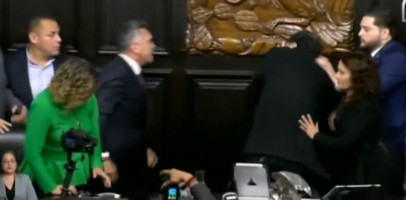Momentos después de concluir la sesión, Moreno subió a la tribuna para reclamar a Fernández Noroña por no haberle cedido la palabra. De acuerdo con testigos, el legislador priista empujó varias veces a su colega y le propinó un manotazo en el cuello. En el forcejeo, también derribó a un hombre que intentó interponerse entre ambos.