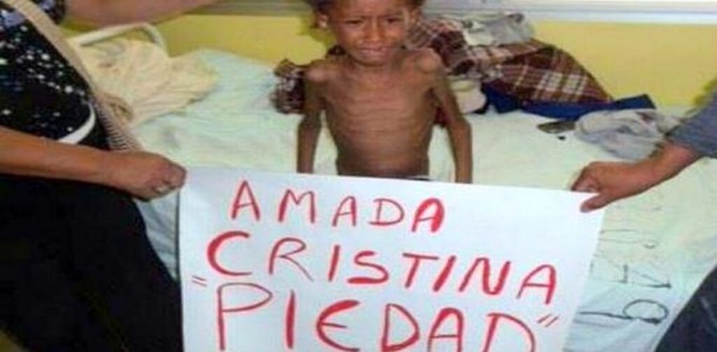 Néstor Femenía, un chico de la etnia qom, que a los 7 años pesaba solamente 20 kilos y sufría desnutrición crónica. Vivía en la provincia de Chaco (noreste) y en una de sus estadías en el hospital fue fotografiado con un cartel que ponía un mensaje a la Presidenta: “Amada Cristina Piedad”.
