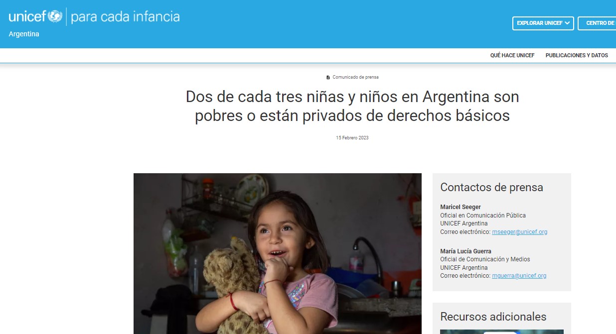 En febrero de 2023, en el último año del gobierno de Alberto Fernández y Cristina Kirchner, UNICEF dio a conocer un espeluznante informe sobre la pobreza infantil en el país, un documento que se puede leer en el siguiente enlace: Dos de cada tres niñas y niños en Argentina son pobres o están privados de derechos básicos