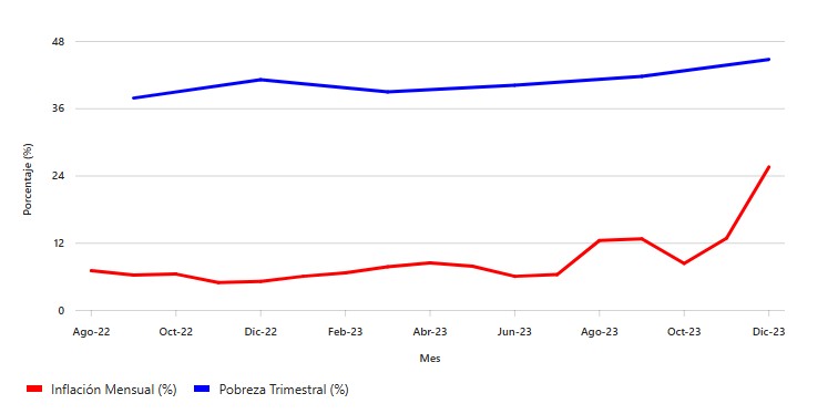 Este gráfico permite ver cómo la inflación se disparó en la segunda mitad de 2023, mientras la pobreza siguió una tendencia ascendente, superando el 44% al cierre del año.