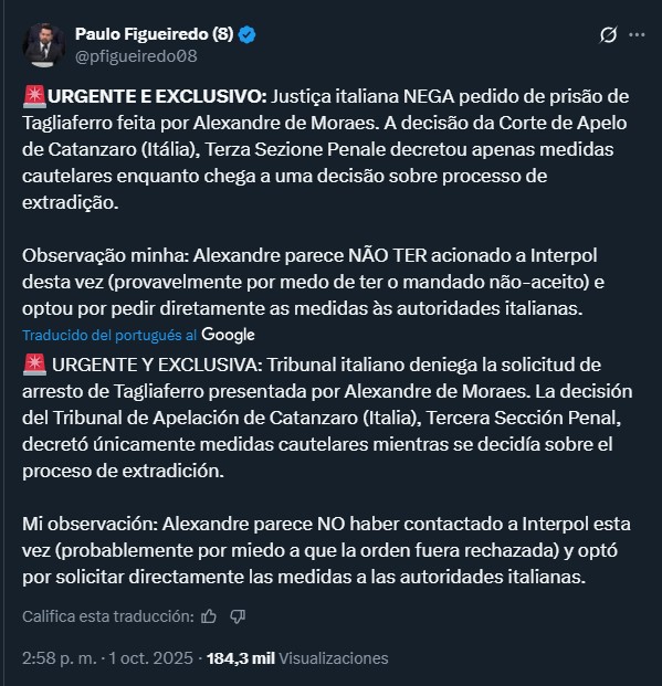 El ex asesor tiene ciudadanía italiana y salió de Brasil acusando de persecución de Moraes, tras filtración de conversaciones a la prensa que, según él, revelarían ilegalidades cometidas cuando Moraes ejercía el cargo de presidente del Tribunal Superior Electoral (TSE), en 2022. El ministro afirmó que no hubo ilegalidad en los actos .