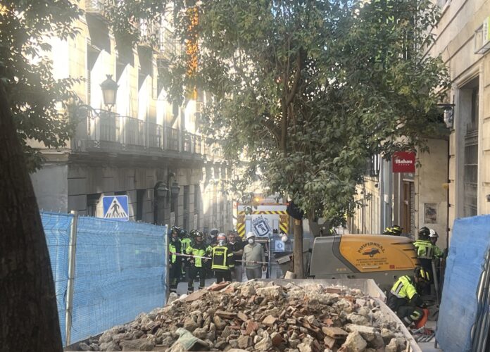 Al menos tres personas han resultado heridas —una de ellas con pronóstico grave— tras el derrumbe parcial del forjado de un edificio de seis plantas situado en el número 6 de la calle Hileras, entre la Puerta del Sol y la plaza de Ópera, en pleno centro de Madrid.