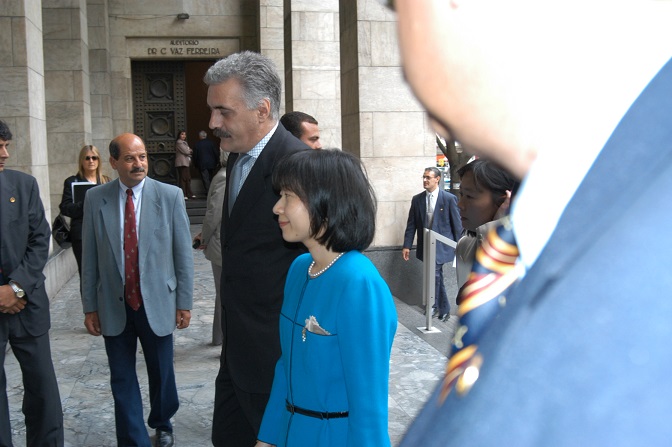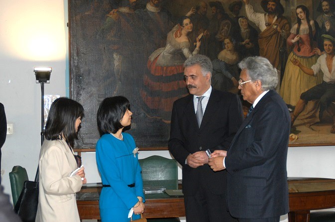 (2003 - Raúl Vallarino recibe a la Princesa Sayako de Japón tras la llegada de los equipos para digitalizar la Biblioteca Nacional de Uruguay)