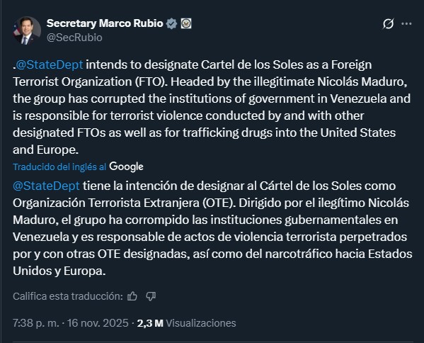 Donald Trump, por su parte, ha sorprendido al declarar que “podría haber discusiones” con Maduro, aunque sin precisar fecha ni condiciones. El presidente estadounidense expresó que es Caracas quien “quiere hablar”, mientras refuerza la presión con el despliegue del portaaviones USS Gerald R. Ford y la designación del Cartel de los Soles —grupo que Washington vincula directamente con Maduro— como organización terrorista extranjera. Esta medida habilita sanciones más severas e incluso ataques a infraestructura dentro de Venezuela.