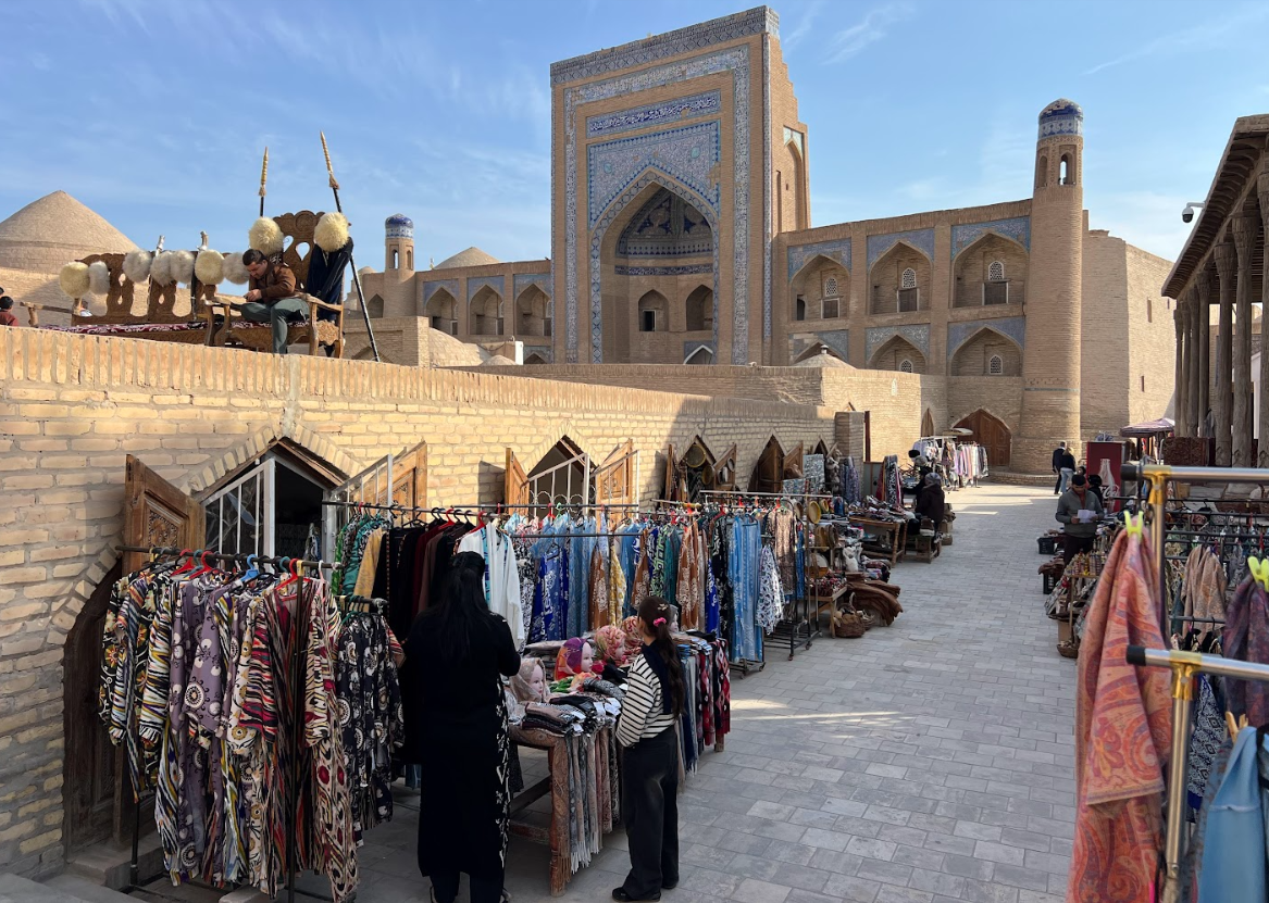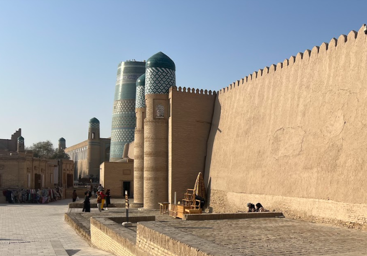 Mientras descendíamos de la ciudadela, la vida cotidiana de Jiva se reveló ante nosotros en el bullicioso mercado local, donde los hilos de seda se entrelazaban con los aromas de la tradición. En los puestos abarrotados, montañas de pañuelos de seda teñidos con tintes naturales desplegaban un arcoíris de bermellones, añiles y dorados – cada uno tejido con los mismos patrones geométricos que habíamos admirado en las fachadas de las madrazas. Pero el verdadero latir de la ciudad lo encontramos en las panaderías tradicionales, donde el tandyr nan (el pan circular uzbeko) se horneaba en hornos de barro subterráneos exactamente como hace cinco siglos. Al observar a un panadero marcar la masa con intrincados dibujos antes de pegarla a las paredes ardientes del tandoor, comprendimos que este pan no era solo alimento: era un lenguaje circular grabado con semillas de sésamo y comino que narraba la historia de cada familia. El olor leñoso y ahumado que impregnaba el aire era el mismo que respiraron los mercaderes de la Ruta de la Seda al llegar a esta ciudad-oasis, donde el trueque de sedas y especias se sellaba compartiendo un pan que, como Jiva misma, mantenía su esencia inalterable entre el pasado y el presente.