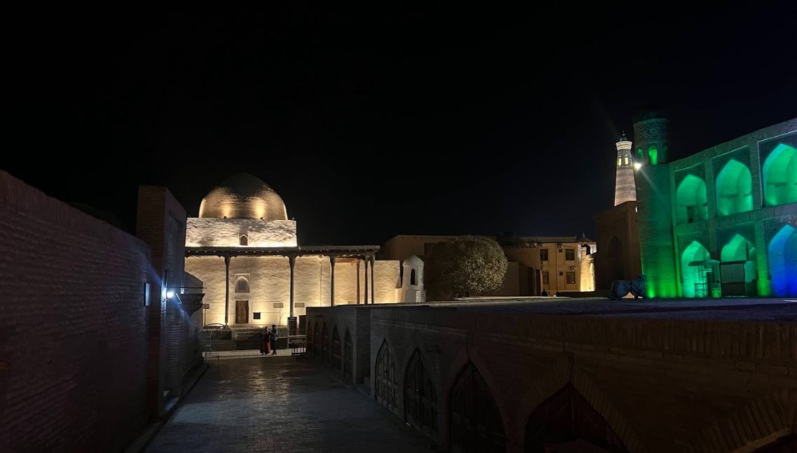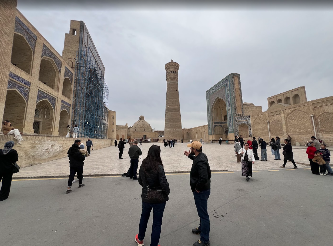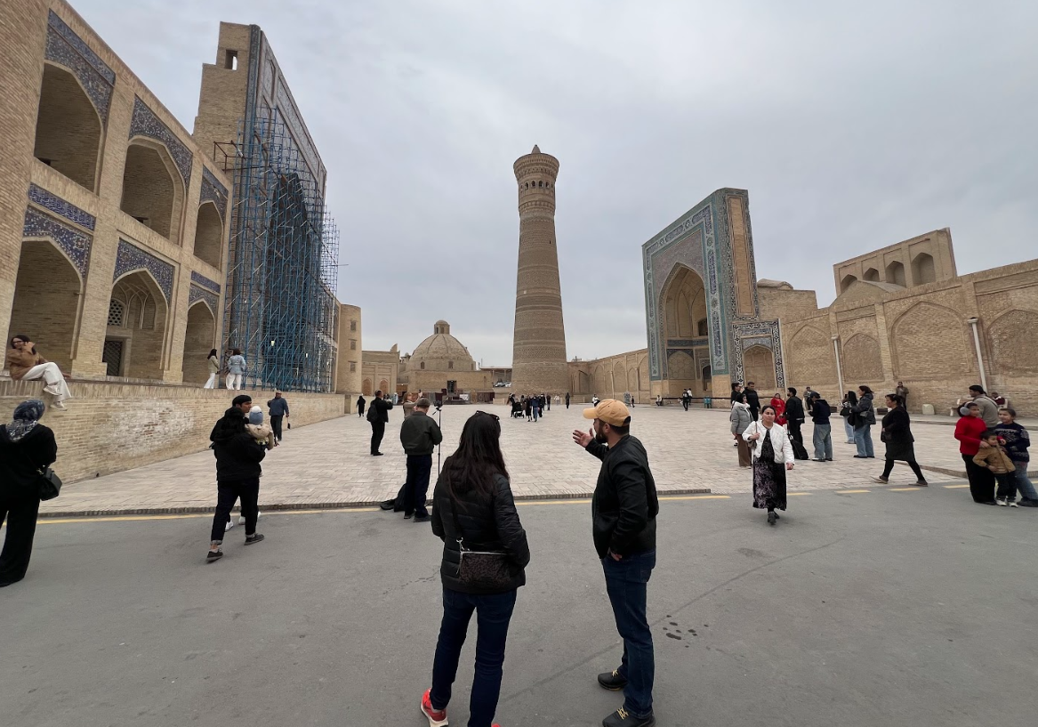 Completan el conjunto la Mezquita Kalón y la Madraza Mir-i-Arab, ambas del siglo XVI. La mezquita, con su vasto patio capaz de albergar a miles de fieles, nos impresionó por la armonía de sus proporciones. Frente a ella, la fachada de la madraza, con sus altos portales azules y sus celdas para los estudiantes, crea un equilibrio monumental. Para nosotros, como ingenieros, este conjunto no era solo un centro espiritual, sino un masterclass en estabilidad y escala, donde la ambición humana se encontraba con la gravedad, y salía victoriosa.