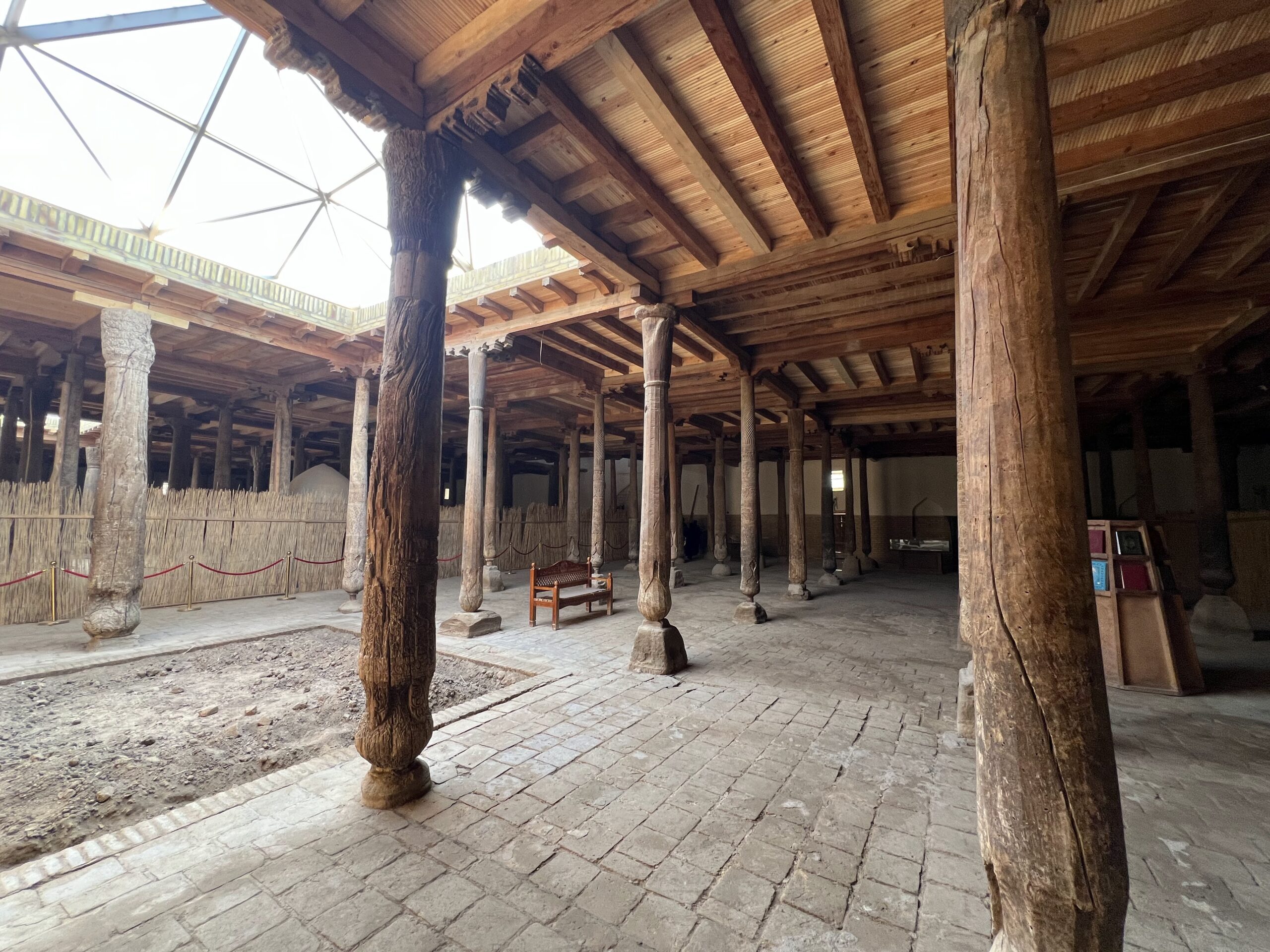 Dentro de la Mezquita Juma, del siglo X aunque reconstruida en el XVIII, nuestra mente de ingenieros se maravilló ante un “bosque” de 212 columnas de madera que sostienen el techo. Algunas de estas columnas, talladas con patrones únicos, datan del propio siglo X. Revisamos la separación entre columnas, que dicen ser el número Pi en metros. Estábamos ante una ingeniería intuitiva y sublime.