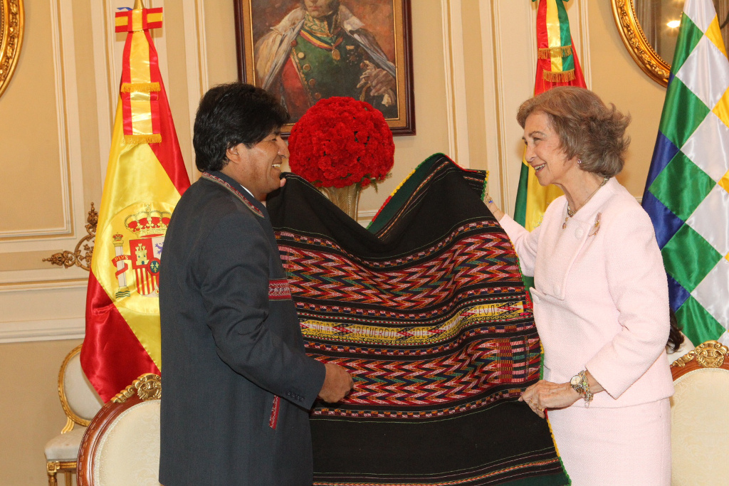 Se olvida Morales, cuando en 2012 recibía con honores en Bolivia a su Majestad la Reina Sofía, acompañada por  el Secretario de Estado de Cooperación Internacional y para Iberoamérica, Jesús Gracia, en un viaje de cooperación al Estado Plurinacional de Bolivia y le regalaba a la visitante una manta típica del país.