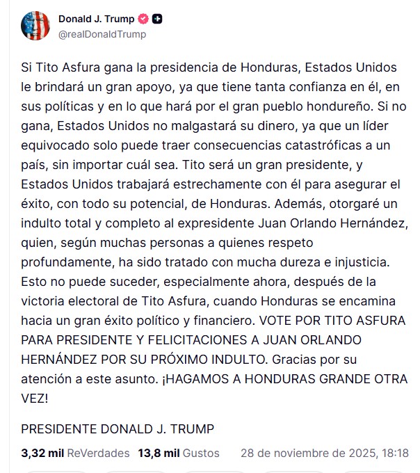 “Si Tito Asfura gana la presidencia de Honduras, Estados Unidos le brindará un gran apoyo, ya que tiene tanta confianza en él, en sus políticas y en lo que hará por el gran pueblo hondureño. Si no gana, Estados Unidos no malgastará su dinero, ya que un líder equivocado solo puede traer consecuencias catastróficas a un país, sin importar cuál sea. Tito será un gran presidente, y Estados Unidos trabajará estrechamente con él para asegurar el éxito, con todo su potencial, de Honduras. Además, otorgaré un indulto total y completo al expresidente Juan Orlando Hernández, quien, según muchas personas a quienes respeto profundamente, ha sido tratado con mucha dureza e injusticia. Esto no puede suceder, especialmente ahora, después de la victoria electoral de Tito Asfura, cuando Honduras se encamina hacia un gran éxito político y financiero. VOTE POR TITO ASFURA PARA PRESIDENTE Y FELICITACIONES A JUAN ORLANDO HERNÁNDEZ POR SU PRÓXIMO INDULTO. Gracias por su atención a este asunto. ¡HAGAMOS A HONDURAS GRANDE OTRA VEZ!”