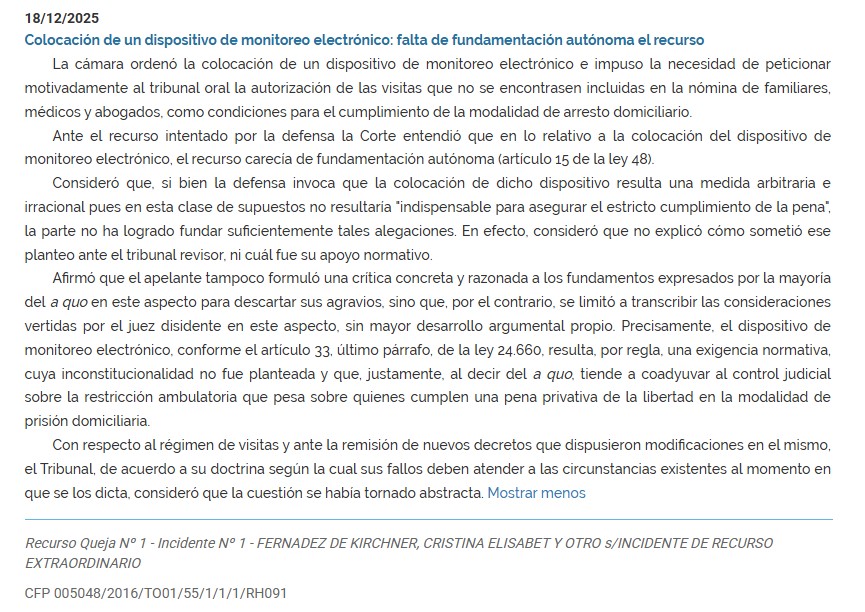 La Corte Suprema de Justicia de Argentina, con la firma de sus tres ministros —Horacio Rosatti, Carlos Rosenkrantz y Ricardo Lorenzetti— ha rechazado este jueves (18) un recurso presentado por la reclusa Cristina Fernández de Kirchner que pedía que le quitaran la tobillera electrónica y de esta manera la Justicia deja en firme la decisión que le ordenó a la ex presidenta la utilización de ese control electrónico.