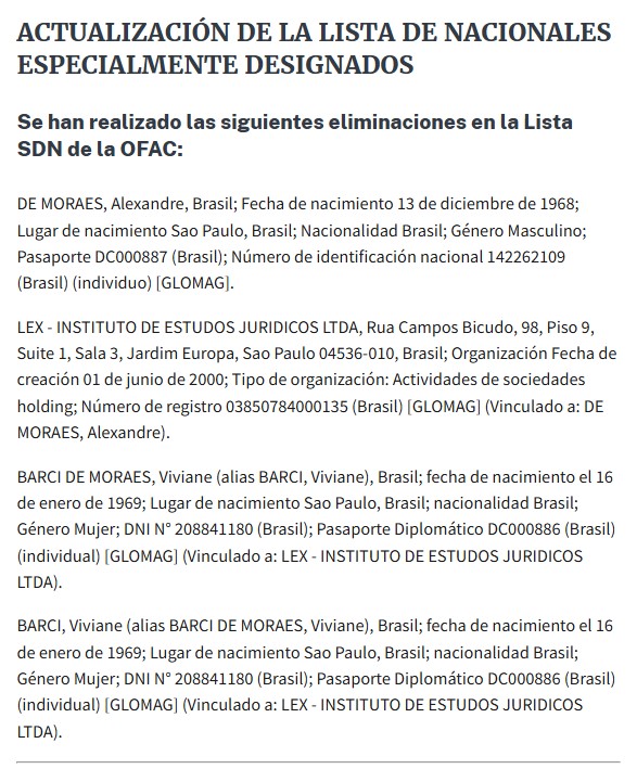EEUU había incluido al juez Alexandre de Moraes —junto con su esposa, Viviane Barci, y la empresa familiar Lex— en la lista de sanciones bajo la Ley Magnitsky Global alegando que fue responsable de: