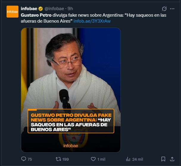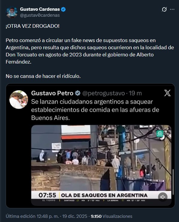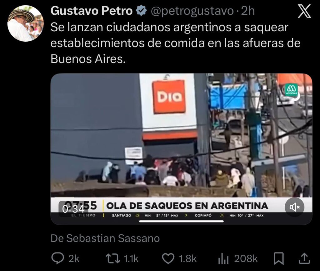 El mensaje del mandatario incluía un video donde se observaban turbas ingresando violentamente a comercios. Petro acompañó las imágenes con una reflexión sobre el “colapso” del modelo libertario. Sin embargo, la verificación de los internautas y de diversos medios de comunicación fue inmediata: el video no es actual.