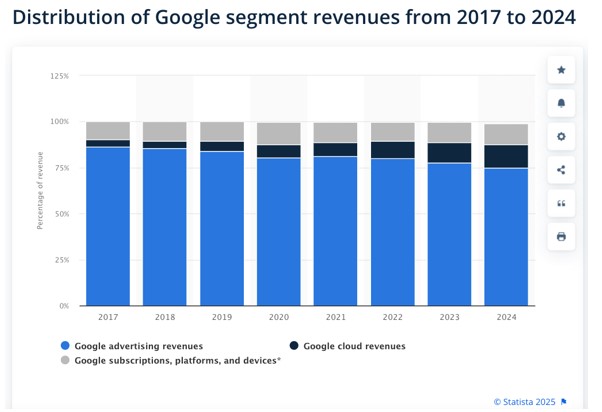 Este segundo cuadro nos muestra como los ingresos del gigante tecnológico se están modificando en su composición, y la publicidad, que ha sido la base de su modelo de negocios, ya ocupa solo un aproximado al 75% de esta cifra. Mi intuición me dice que esta gráfica está mostrando una tendencia que se va a acelerar en la pérdida de importancia de los componentes publicitarios que alimentan la alcancía de Google. ¿Porqué? Aquí va mi respuesta:
