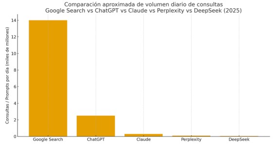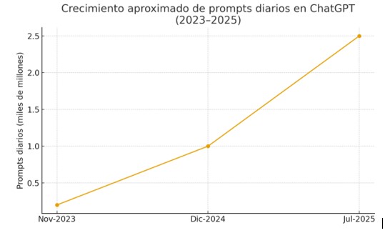 Aquí vemos como el crecimiento exponencial de ChatGPT como “motor de respuestas” se está acelerando y se prevé que llegará al fin de este año a una cifra cercana a los 5.000 millones de instrucciones o búsquedas diarias (por simplificar el término “prompt” para los efectos de este artículo).