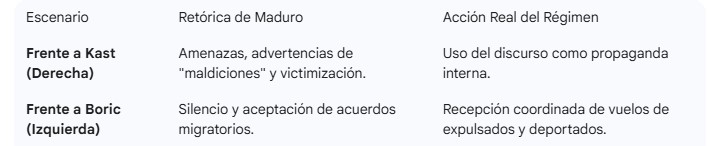 Sin embargo, detrás de la cortina de humo mediática y los insultos televisados, la realidad operativa cuenta una historia muy distinta. Maduro no solo no ha cumplido sus profecías de “secamiento” contra el actual gobierno chileno, sino que ha mantenido una colaboración técnica fluida con la administración de Gabriel Boric para recibir a cientos de venezolanos expulsados.