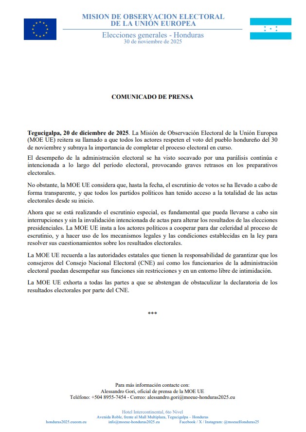 La Misión de Observación Electoral de la Unión Europea (MOE UE) reitera en un comunicado emitido este sábado 20 de diciembre su llamado a que todos los actores respeten el voto del pueblo hondureño del 30 de noviembre y subraya la importancia de completar el proceso electoral en curso.