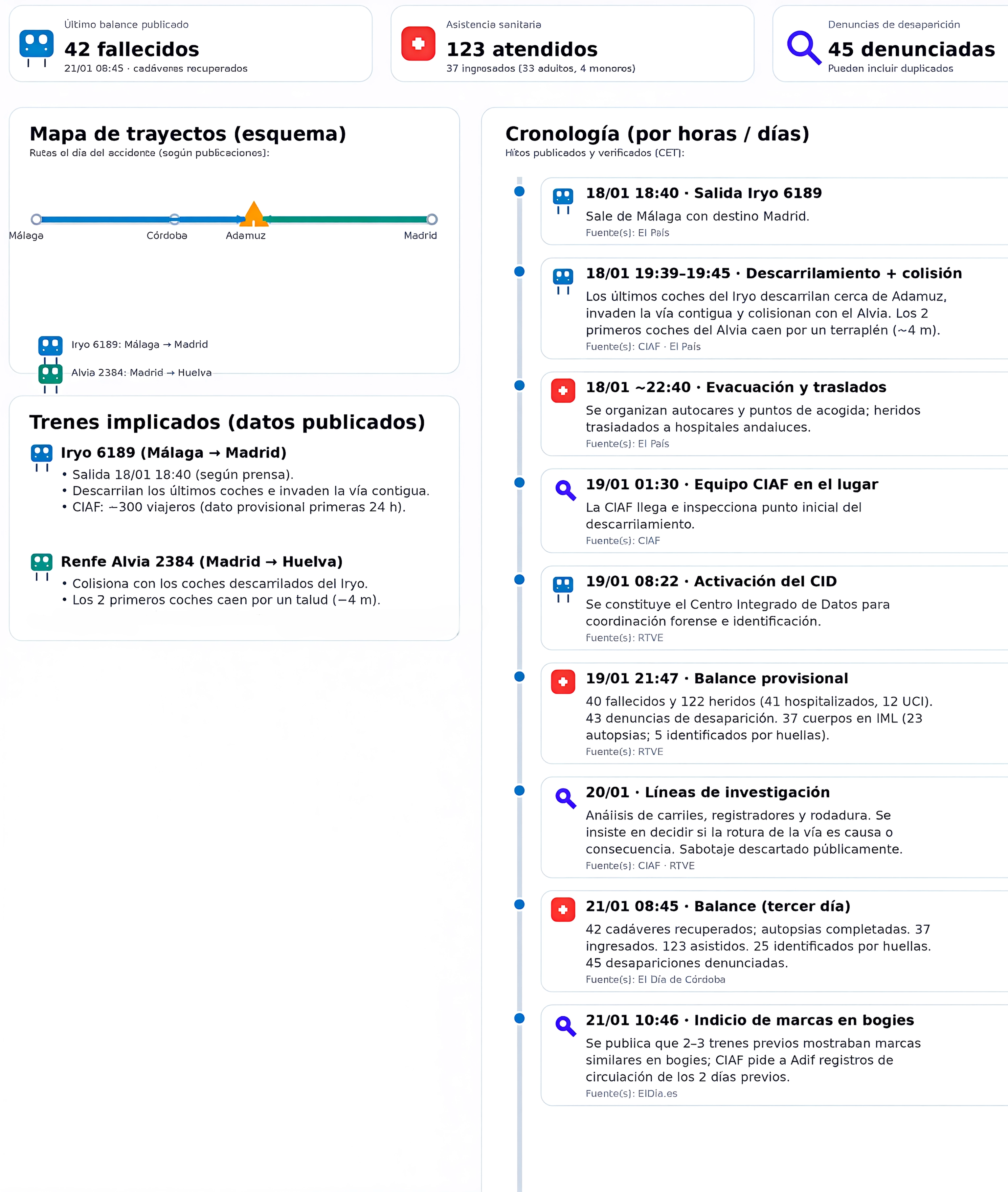 Las labores de emergencia e identificación tras el accidente ferroviario ocurrido el domingo 18 de enero en el entorno de Adamuz (Córdoba) continúan avanzando mientras la investigación técnica sigue abierta. El último balance publicado a primera hora de hoy sitúa en 42 el número de fallecidos recuperados, con autopsias ya realizadas en el Instituto de Medicina Legal, y 37 personas hospitalizadas (33 adultos y 4 menores) de un total de 123 personas atendidas. Paralelamente, se mantienen 45 denuncias de desaparición, un indicador que aún requiere depuración administrativa (posibles duplicidades y cruces con listados).