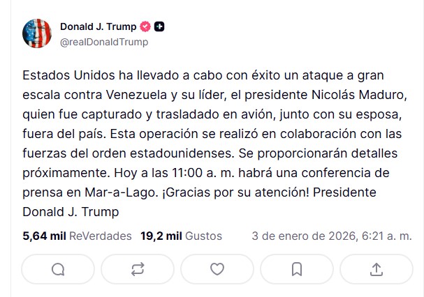 El presidente de los Estados Unidos, Donald Trump, anunció la madrugada de este sábado 3 de enero de 2026 que fuerzas estadounidenses han capturado a Nicolás Maduro y a su esposa, Cilia Flores, tras un ataque militar a gran escala en territorio venezolano.