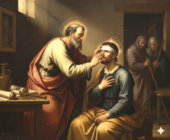 La curación: Ananías impuso sus manos sobre Saulo, diciendo que el Señor lo enviaba para que recuperara la vista y fuera lleno del Espíritu Santo.