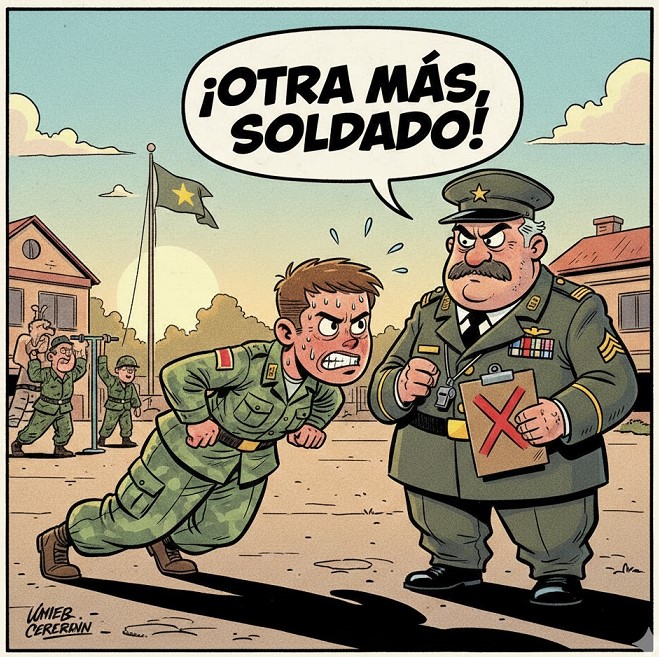 Sargento González: — ¿Talleres de qué? ¡Acá el único ritmo que va a seguir es el de mis botas contra el suelo! ¡Esa gorrita se la saca ya mismo o se la hago tragar como si fuera un refuerzo de mortadela! ¡AQUÍ SE VIENE A APRENDER DISCIPLINA!