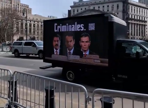 La acción publicitaria coincidió estratégicamente con la masiva concentración de la comunidad venezolana frente a la Corte Federal del Distrito Sur de Nueva York. Este es el tribunal donde Nicolás Maduro y su esposa, Cilia Flores, enfrentan graves cargos por narcoterrorismo y lavado de dinero.