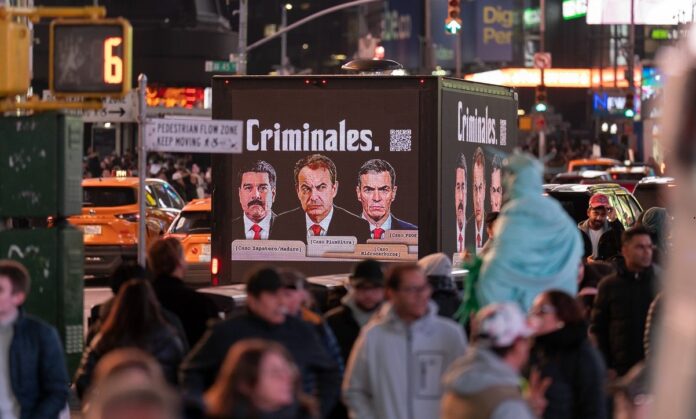 NUEVA YORK – Las calles de la Gran Manzana se convirtieron este fin de semana en el escenario de una punzante campaña de denuncia política. La organización española Hazte Oír desplegó una serie de unidades móviles y cartelería digital para señalar directamente a Nicolás Maduro, al expresidente José Luis Rodríguez Zapatero y al actual presidente del Gobierno de España, Pedro Sánchez.