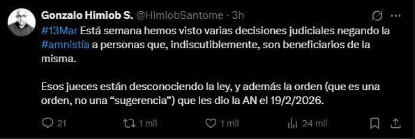 “Esta semana hemos visto varias decisiones judiciales negando la amnistía a personas que, indiscutiblemente, son beneficiarios de la misma”, sentenció Himiob.