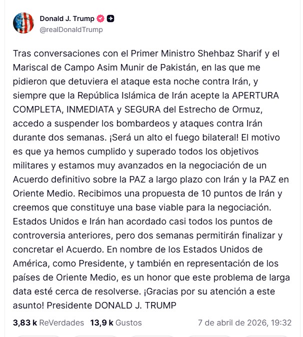 “Tras dialogar con los líderes de Pakistán, he decidido dar una oportunidad a la diplomacia. El ataque se pospone dos semanas mientras evaluamos la voluntad de Irán para cooperar”, afirmó el presidente.