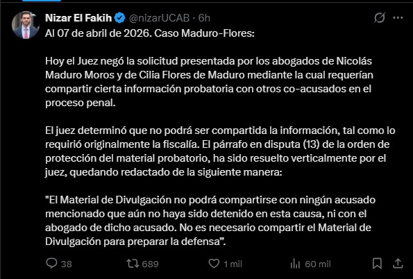 De acuerdo con lo reportado por el abogado venezolano Nizar El Fakih, la decisión judicial se alinea con la postura de la fiscalía. El dictamen prohíbe estrictamente que el material sensible del caso sea distribuido entre partes involucradas que todavía no han comparecido formalmente ante la justicia.