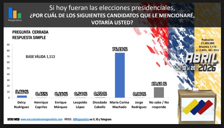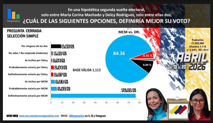 CARACAS – El más reciente informe de la firma encuestadora Meganálisis, correspondiente al mes de abril de 2026, arroja cifras contundentes que redefinen el tablero político venezolano. Según el estudio, la líder de la oposición democrática, María Corina Machado, concentra un 71,25% de intención de voto, una cifra que pone en jaque la estabilidad del gobierno de facto encabezado por Delcy Rodríguez.