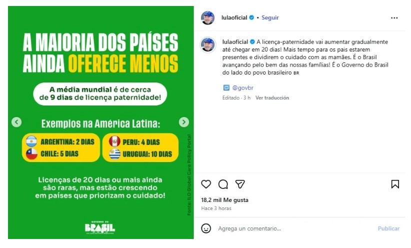 Lula divulgó que en Uruguay la licencia por paternidad es de diez días, cuando la ley vigente establece 20. Brasil pasará de cinco a 20, pero lo hará de forma gradual hasta 2029.
