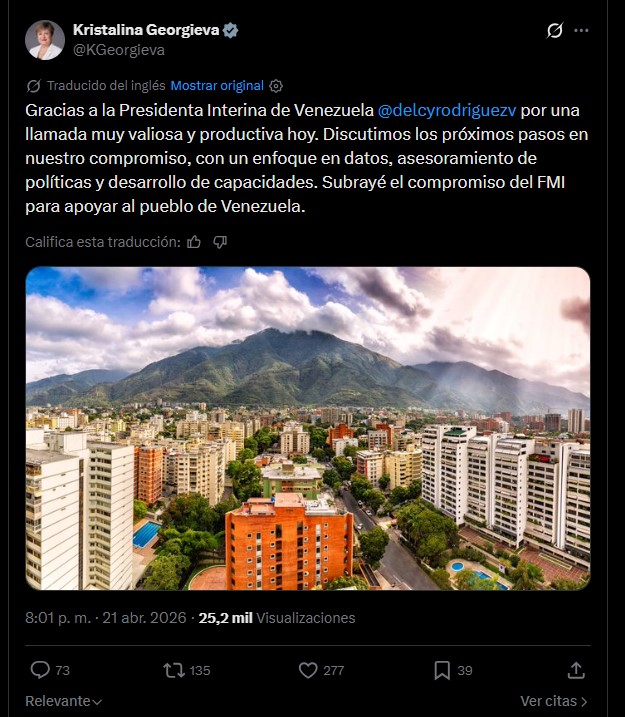 “Discutimos los próximos pasos en nuestro compromiso… Subrayé el compromiso del FMI para apoyar al pueblo de Venezuela”. — Kristalina Georgieva vía X.