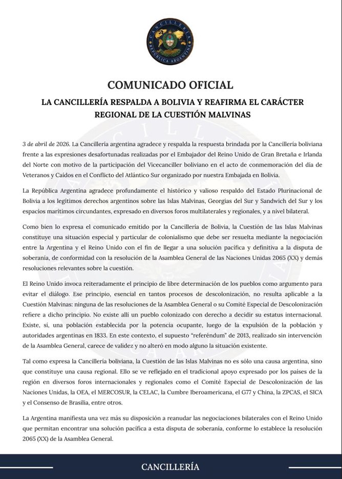 Ante la escalada dialéctica, el Ministerio de Relaciones Exteriores de Argentina emitió un comunicado oficial agradeciendo el “histórico y valioso respaldo” de Bolivia. En el texto, el Gobierno argentino no solo reafirmó sus derechos sobre las Malvinas, Georgias del Sur y Sandwich del Sur, sino que también rebatió los argumentos británicos punto por punto: